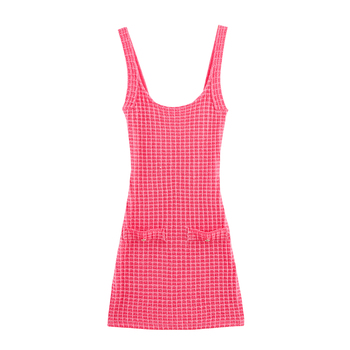 Pink Color Plaid Pattern Knitted Casual Fashion Mini tank Top Dress for Women