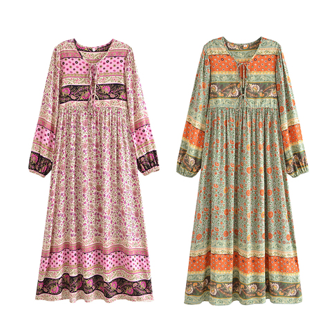 2 Colorway 꽃 무늬 프린트 긴 소매 v 목 앞 레이스 업 캐주얼 패션 여성 보헤미안 맥시 원피스